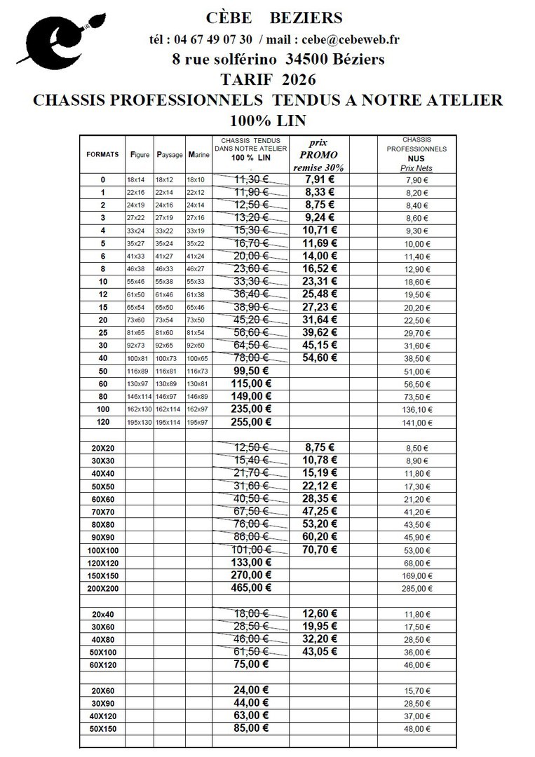 Ces toiles sont tendues dans notre atelier avec une toile 100% lin (toile 500gr/m² avec une enduction universelle 3 couches) sur des châssis en pin de qualité professionnelle et de fabrication Française.(la force du châssis augmente en fonction du format)
